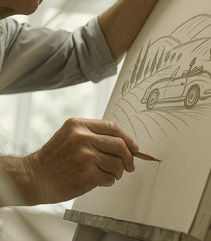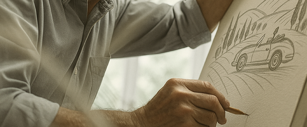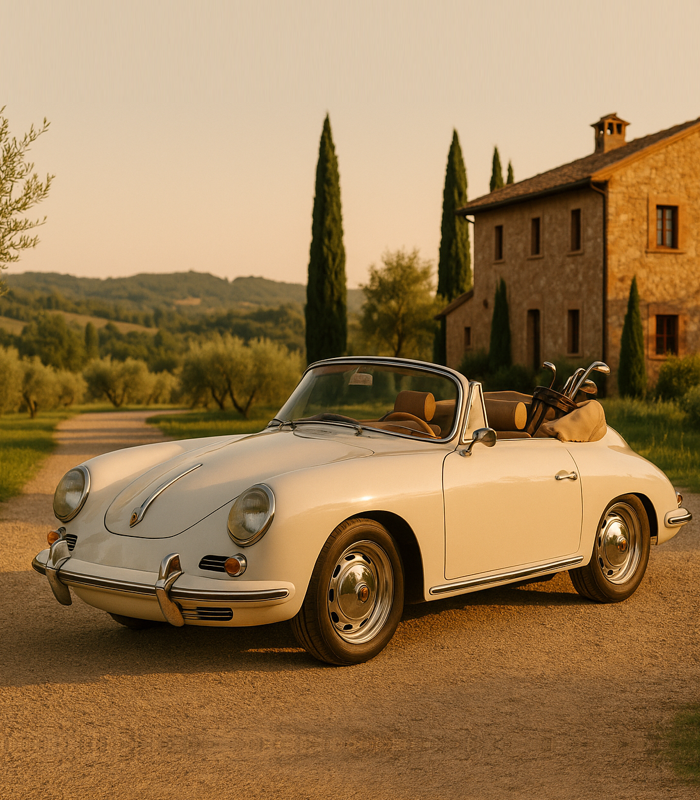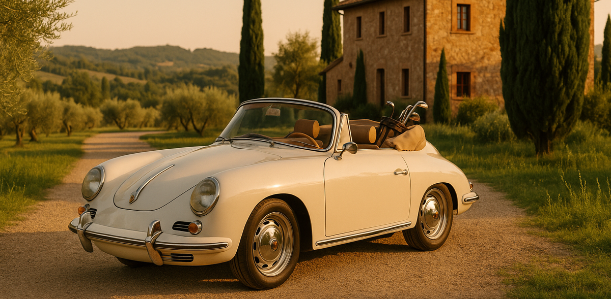 Mit dem Golfbag auf der Rückbank und dem Porsche 356 durch die kurvigen Bergstraßen Italiens – der Fahrtwind warm, die Abendsonne gold. Ein Moment zwischen Freiheit, Stil und Leidenschaft. Hole Dir das Gefühl auf den Platz.